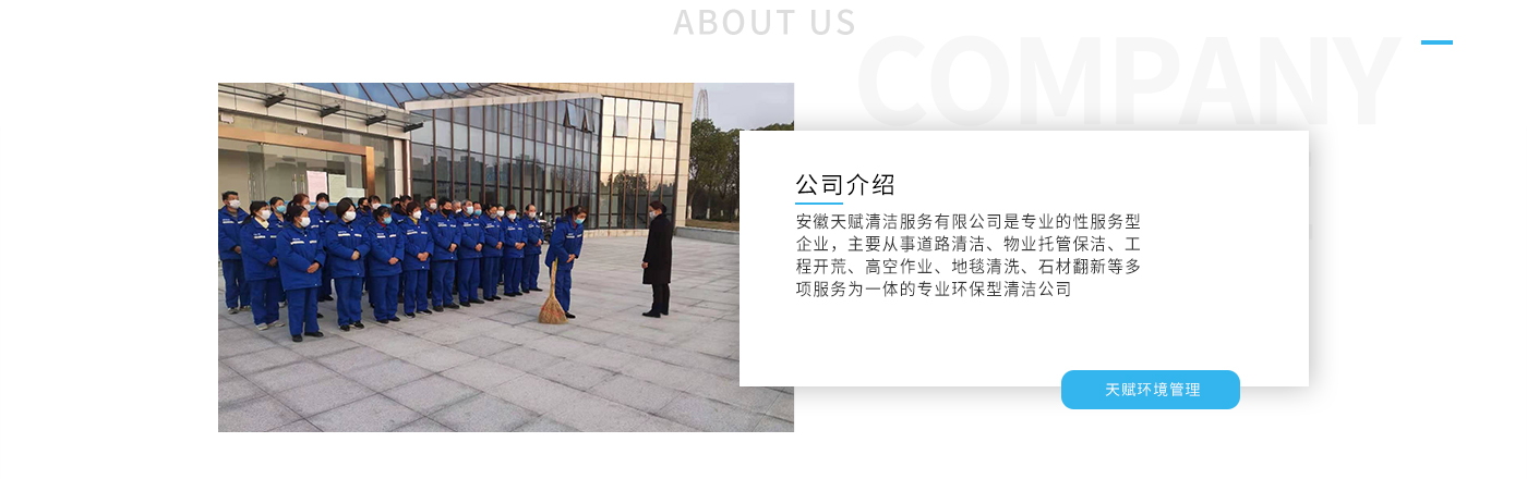 安徽天賦清潔服務(wù)有限公司是的服務(wù)型企業(yè),主要從事道路清潔、物業(yè)托管保潔、工程開荒、高空作業(yè)、地毯清洗、石材翻新等多項服務(wù)為一體的環(huán)保型清潔公司。公司管理機制完善,清潔作業(yè)經(jīng)驗豐富,擁有技術(shù)力量,嚴格實行崗前培訓(xùn)—崗中督查—上崗在培訓(xùn)的員工管理措施,憑著優(yōu)良的清潔質(zhì)量和嚴格的督查管理,為眾多企事業(yè)單位、醫(yī)院、酒店、廠區(qū)商場、物業(yè)、道路、學(xué)校、公園等提供后勤清潔服務(wù)。在業(yè)內(nèi)擁有良好的口碑。工作人員,服務(wù)態(tài)度優(yōu),竭力為客戶提供好的保潔服務(wù)。安徽天賦清潔服務(wù)有限公司:致力于長期合作關(guān)系,提高服務(wù)質(zhì)量,提供高標準的清潔服務(wù)。公司的經(jīng)營理念:為營造一個更清潔、亮麗的生活和工作環(huán)境而努力!“誠信”是公司成功保證。“客戶至上,信譽為首”是公司宗旨。高標準提供服務(wù),維護客戶利益、形象,是我始終不渝的目標。